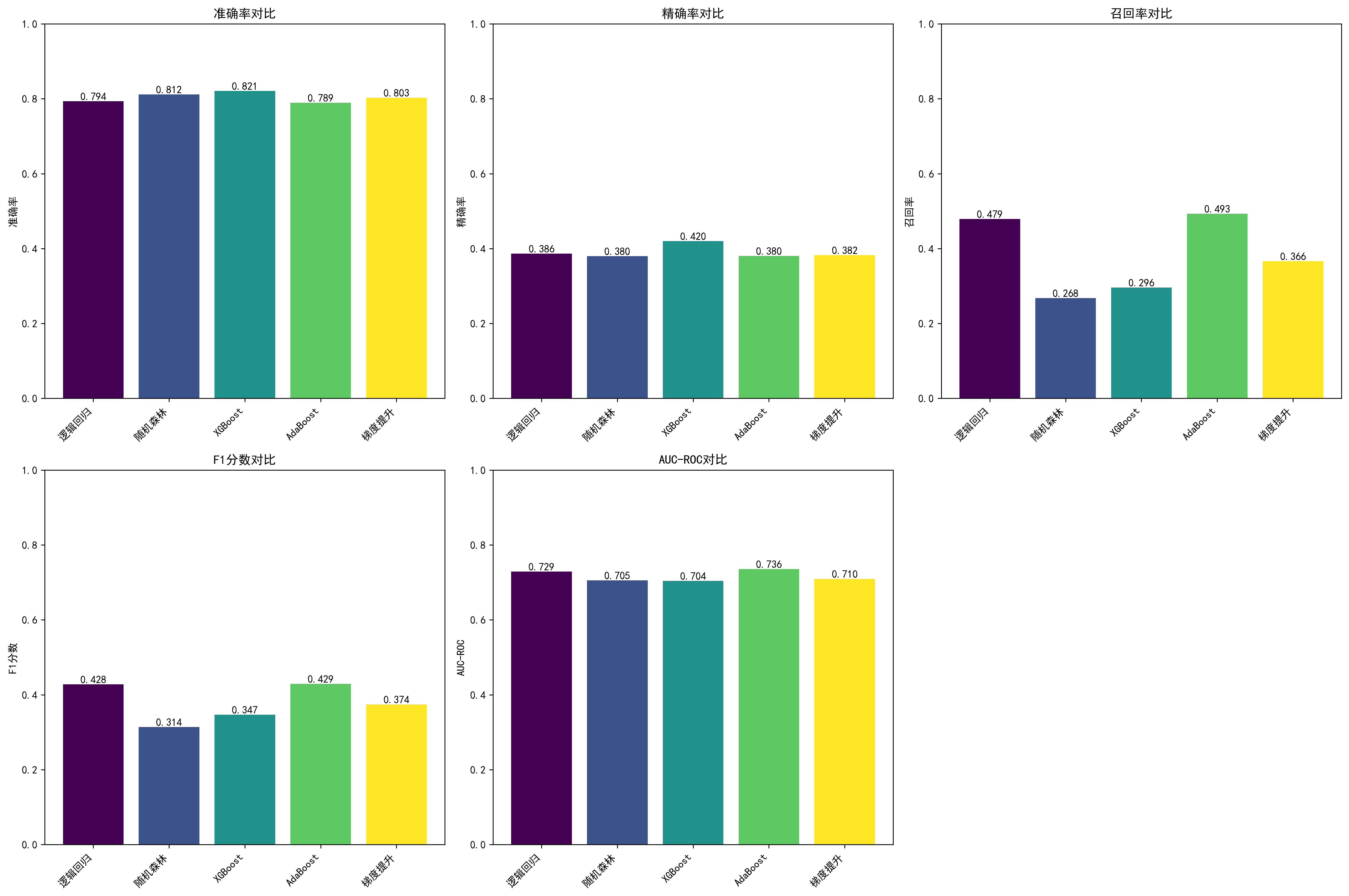 AdaBoost 综合表现最佳。 AI 复现结果中,AdaBoost 在 Recall(0.4930)、F1(0.4294)和 AUC-ROC(0.7359)三个指标上均为最高,与原论文"AdaBoost 表现最优"的结论一致。